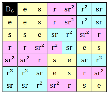 Cosets as colors: Note that the cosets of H = {e,s} in D₆ show H is not normal, so we cannot construct the same table we did with the cosets of H = {e, r, r², r³} in D₈: