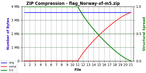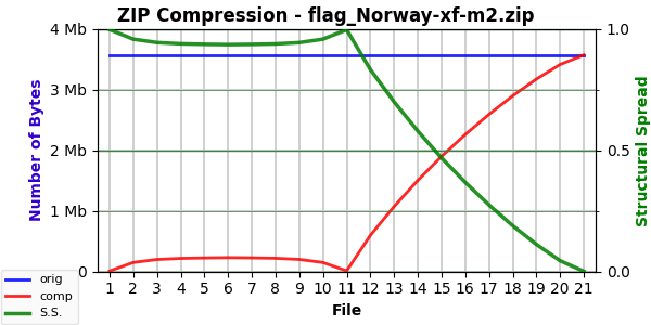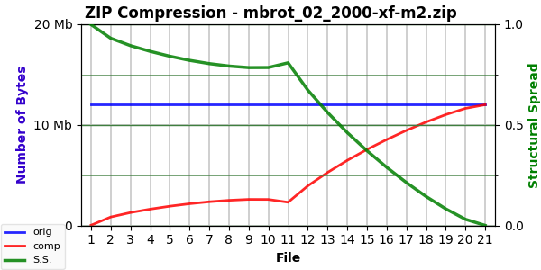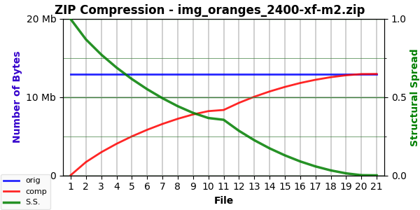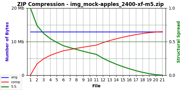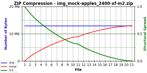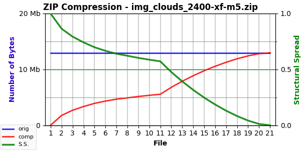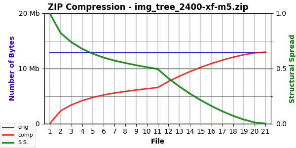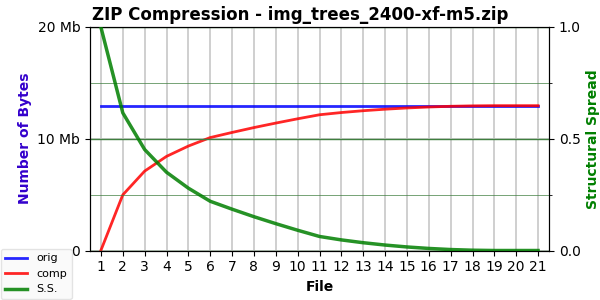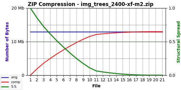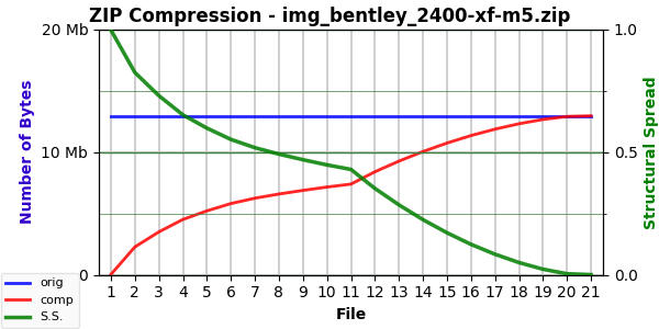To see a hint of the difference, look where the green line crosses the blue line. Of key interest in these is where the green line is for file #11, the original image. Check where this point, the characteristic compression of the image, is relative to the 0.5 horizontal (see right side of chart with normalized compression scale). The simpler “Tree” and “Clouds” image were above 0.5 — the “Bentley” image is below.
